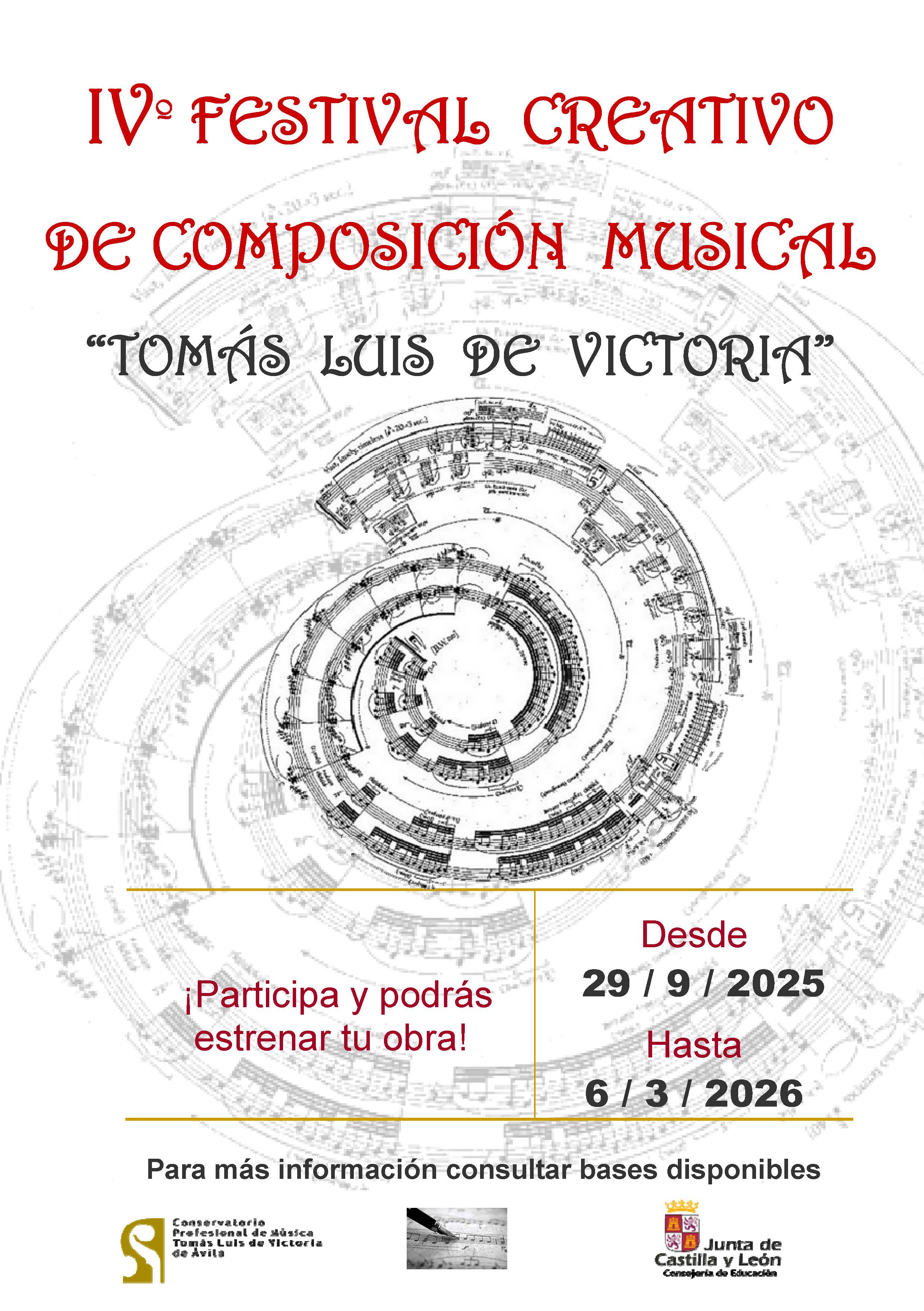 El Departamento de Teoría de la Música, del Conservatorio Profesional de Música Tomás Luis de Victoria,de Ávila, convoca el 3.er Festival Creativo de Composición Musical. Su finalidad es estimular la creatividad del alumnado a través de la composición musical.