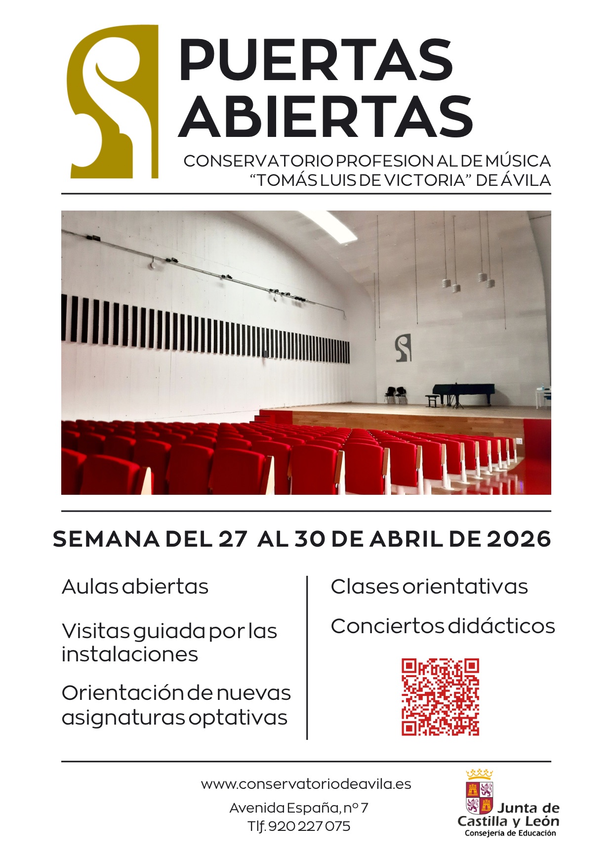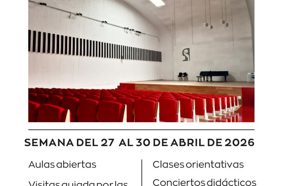 La semana del 27 al 30 de abril de 2026 realizamos nuestras jornadas de puertas abiertas. En ellas podréis ver la actividad que hacemos en el conservatorio, asistir a conciertos, ver ensayos y conocer nuestro centro.